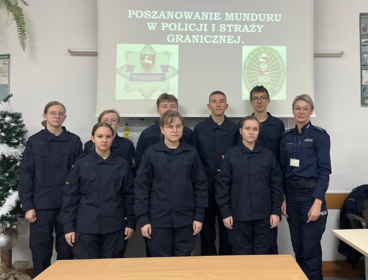 Wczoraj w nowo utworzonym oddziale o profilu mundurowym w Liceum Ogólnokształcącym im. Stanisława Kostki Starowieyskiego w Łaszczowie asp. Monika Ryczek z tomaszowskiej Komendy przeprowadziła lekcję na temat poszanowania munduru w formacjach mundurowych. Spotkanie miało związek z realizacją podstawy programowej w ramach trójstronnego porozumienia pomiędzy Policją, Strażą Graniczną a Liceum w Łaszczowie.