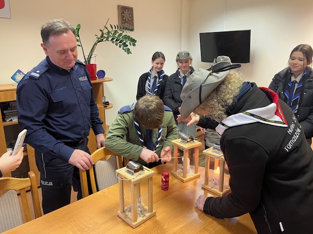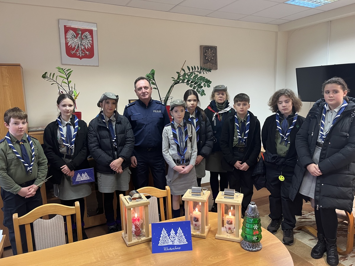 W tomaszowskiej komendzie gościli dzisiaj przedstawiciele Związku Harcerstwa Polskiego „Hufiec” Tomaszów Lubelski na czele z harcmistrzem Anną Bartnicką. Harcerze przekazali na ręce I Zastępcy Komendanta Powiatowego Policji w Tomaszowie Lubelskim podinsp. Bogdana Kulasa Betlejemskie Światło Pokoju. Pan Komendant w imieniu kierownictwa oraz policjantów i pracowników Policji serdecznie podziękował harcerzom za ten piękny dar, pamięć oraz zaangażowanie. Złożył również życzenia z okazji Świąt Bożego Narodzenia oraz zbliżającego się Nowego 2026 Roku.
