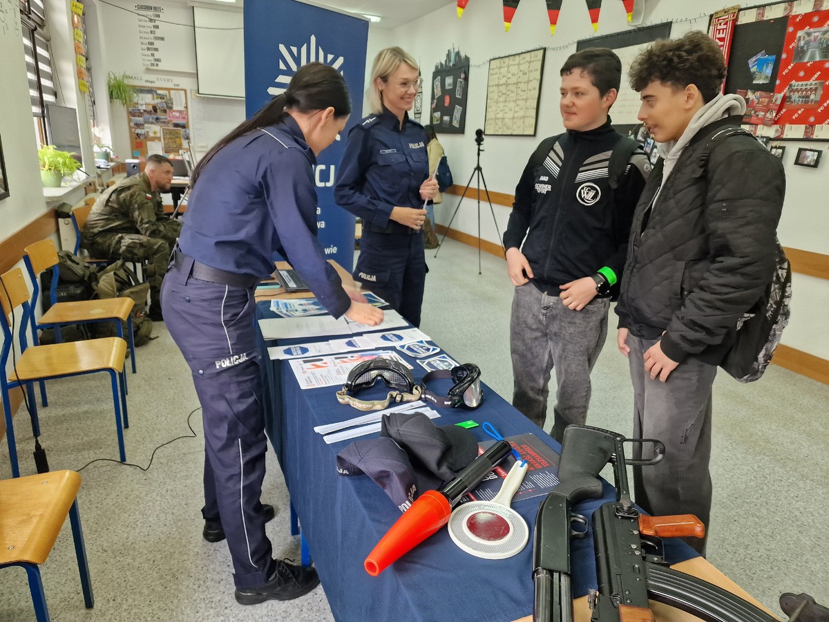 Policyjne stoisko cieszyło się dużym zainteresowaniem, a praktyczna wiedza zdobyta w bezpośrednim kontakcie z policjantami z pewnością zaprocentuje w późniejszej nauce i zachęci do wstąpienia w szeregi służb mundurowych.