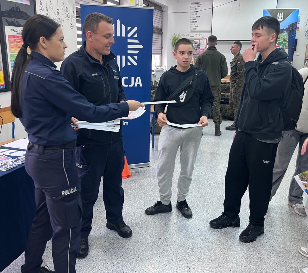 Zainteresowani mieli możliwość dowiedzieć się jak wygląda proces rekrutacji kandydata do służby w Policji. Podczas pogadanki, uczniowie uzyskali cenne, praktyczne wskazówki jak przygotować się do etapu sprawności fizycznej, testu wiedzy oraz badań psychologicznych. Przyszli uczniowie mieli okazję z bliska obejrzeć policyjny sprzęt w tym zapoznać się z zawartością walizki kryminalistycznej. Dzielnicowy miejscowego posterunku, udzielał wyczerpujących informacji na temat służby oraz promował ogólnopolską kampanię społeczną na rzecz bezpieczeństwa seniorów pod nazwą #ZnamTeNumery.